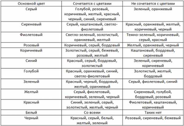 Основной цвет | Хорошее сочетание | Плохое сочетание | Влияние/Кому подходит | Стиль |