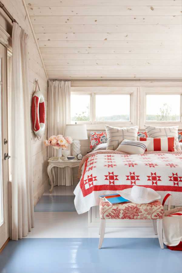 Средний синий оттенок очаровательно будет смотреться в спальной комнате морского стиля вместе с красным и белым. А также насыщенный синий оттенок хорошо выглядит с бежевым либо цветом слоновой кости. Светлые и средние синие оттенки оптимально сочетаются с оттенками белого.