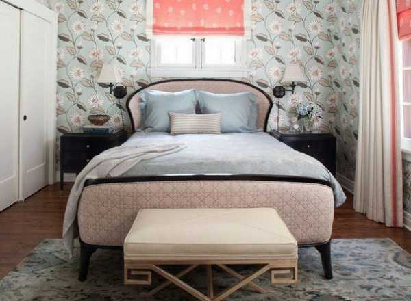 Чтобы выделить одну стену (у изголовья), надо вокруг кровати наклеить яркие обои, но подобрать сочетание с другими.
