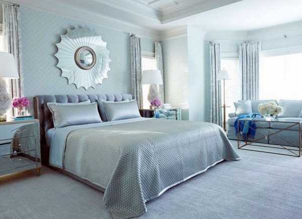 Присутствие мерцающего серебра делает интерьер роскошным. Используя серебристый блеск, как основу Вашей цветовой палитры для спальни (в сочетании с матовым синим цветом),
