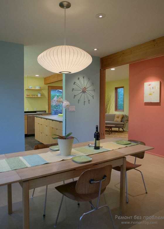 Интерьер большой комнаты выполнен в необычном цветовом решении, что позволяет зрительно разделить помещение на зоны, а яркие расцветки текстиля не позволят интерьеру быть скучным и однообразным.