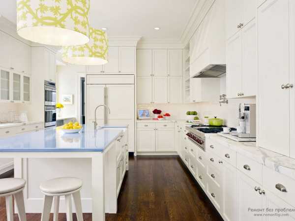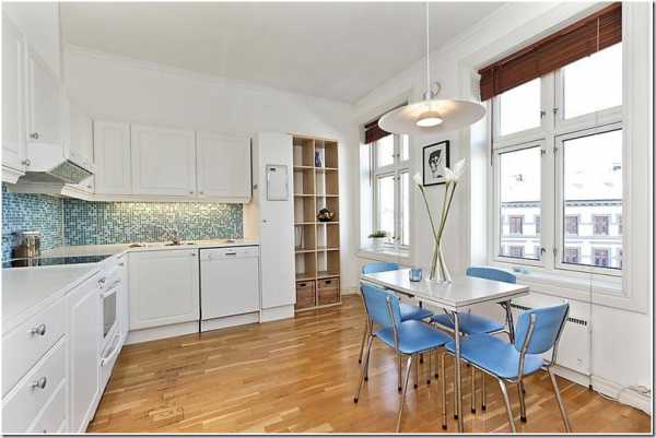 Белоснежная кухня, в сочетании с белой мебелью зрительно увеличивает пространство, а мебель сочного голубого цвета делает комнату более жизнерадостной и нарядной.