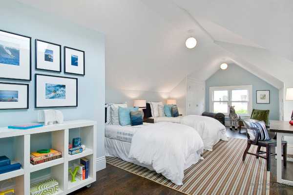 Многогранное сочетание оттенков синего с белым позволяет комнату поделить на зоны, а использование замысловатых элементов в дизайне оживит интерьер и добавит уюта помещению.