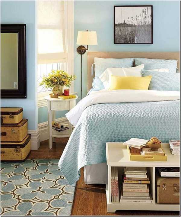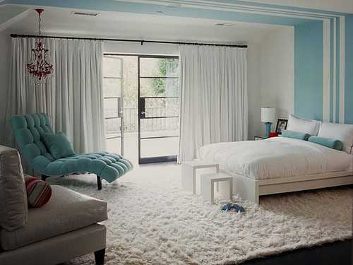 нежно голубой цвет в комбинации с белым приносит в интерьер спальни спокойствие и умиротворенность