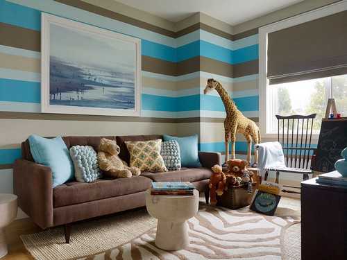 Интерьер комнаты оформлен в коричнево-голубых тонах, что довольно нестандартно и смело, такой вариант подойдет тем, кто неравнодушен к душевному комфорту, царящему в доме.