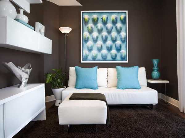 В маленьких помещениях, лазурные стены следует украшать яркими картинами или сочетать их с оранжевыми и жёлтыми деталями. При выборе мебели, стоит отдавать предпочтение дереву светлых тонов.