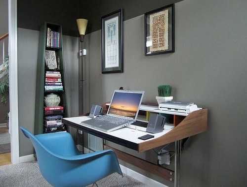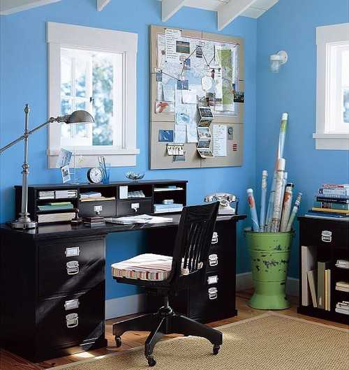 Интересное решение жизненного пространства гостиной, которая стеклянным шкафом поделена на зоны, а красивый голубой цвет стен создаст радостное настроение и желание работать.