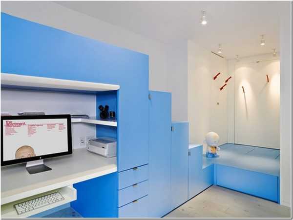 Четкие и строгие линии в сочетании с оттенками синего делают интерьер выдержанным и деловым, но мебель белого цвета сглаживает и уравновешивает холодность синего.