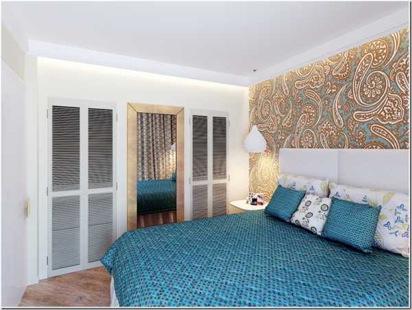 Центральное место в интерьере спальни занимает просторная и удобная кровать, изголовье которой оформлено оригинально и ярко, а оживить спальню можно бирюзовым покрывалом и подушками в тон.