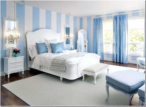Спальня белого цвета отделана обоями с голубой полосой, что позволит зрительно увеличить высоту потолков, а использовав шторы, такого же оттенка есть возможность расширить окно.