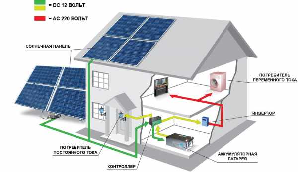 Схема для повседневной эксплуатации и разводкой по розеткам. Солнечные батареи устанавливают на крышу (или отдельную металлическую конструкцию), а кабель от них прокладывают к аккумулятору, от которого электричество через преобразователь поступает на розетки.