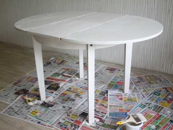 - Затем всю поверхность стола окрасьте белой краской, включая места, натертые воском. Используйте флейцевую кисть или валик.