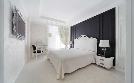 Сочетание черного и белого – это классика. Спальня, выполненная в такой гамме, изысканна и динамична. Больше белой мебели и декора – комната будет нежной. Акцент на черный цвет добавит драматизма и готических ноток. А вот варианты такого приема и фото в подтверждение слов.