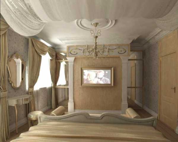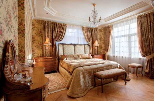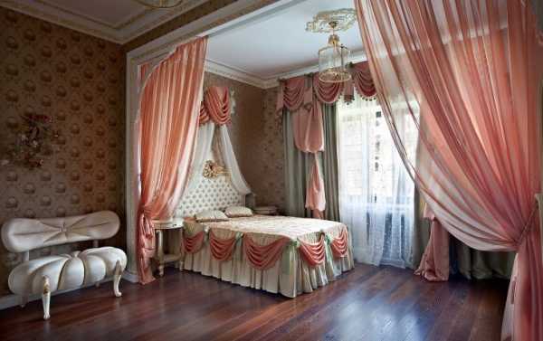 Окна украшаются портьерами с пышными драпировками, ламбрекенами, подхватами с бахромой. Они ниспадают легкими волнами от самого потолка. Расцветка штор должна гармонировать с остальным текстилем в спальне.