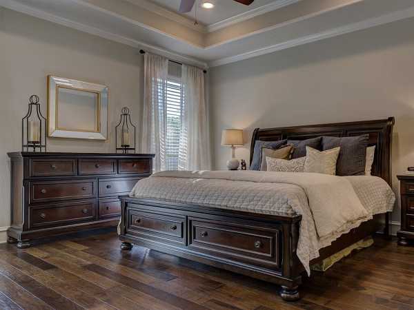 Дизайн спальни в английском стиле позволяет обставить комнату качественной, дорогой мебелью изготовленной из благородных сортов древесины, таких как дуб или красное дерево.