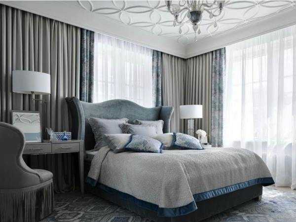 Шторы лучше всего делать двойными – днем полупрозрачные занавески из невесомой тафты не будут мешать проникновению солнечного света в спальню, а вечером спальню спрячут плотные шторы из бархата или парчи, чтобы не чувствовать себя как в аквариуме. Цветовая гамма используется в зависимости от тона стен. Наиболее удачным вариантом считается, если шторы будут на несколько позиций светлее или темнее цвета отделки стен. Текстиль обязательно должен гармонировать и перекликаться с другими оттенками, существующими в комнате. Интересным решением станет изготовление нескольких текстильных элементов из одного и того же материала.