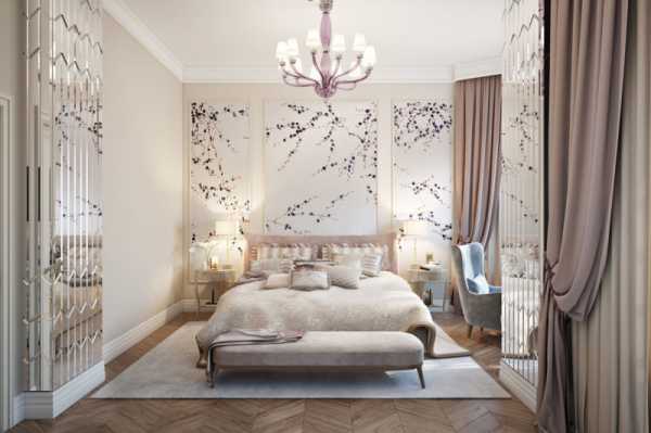 | Розовый | Романтичность | Сочетается лишь с белым, лиловым, цветом шоколада. С остальными цветами сделает спальню излишне яркой. |