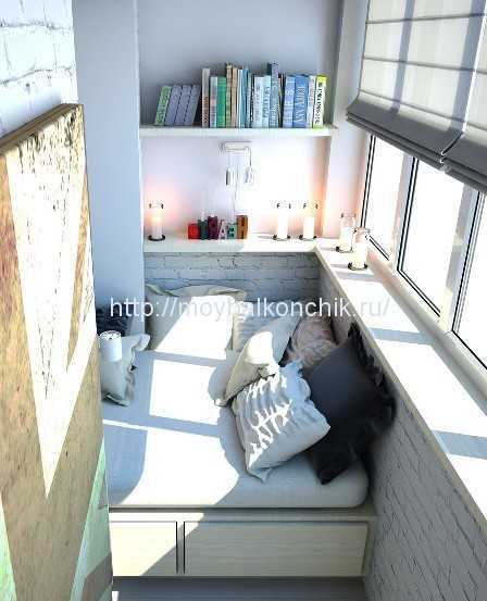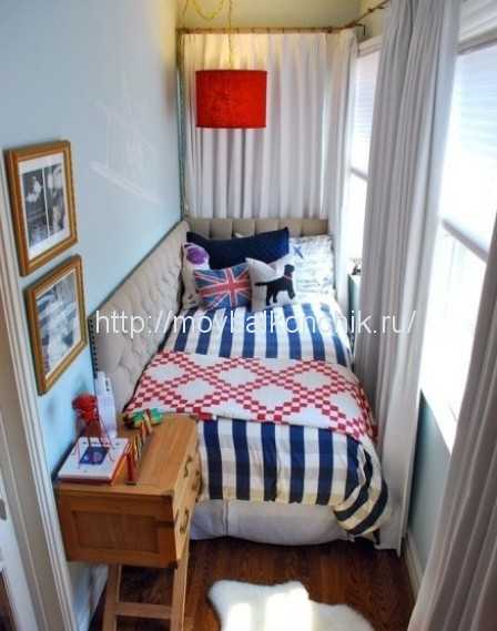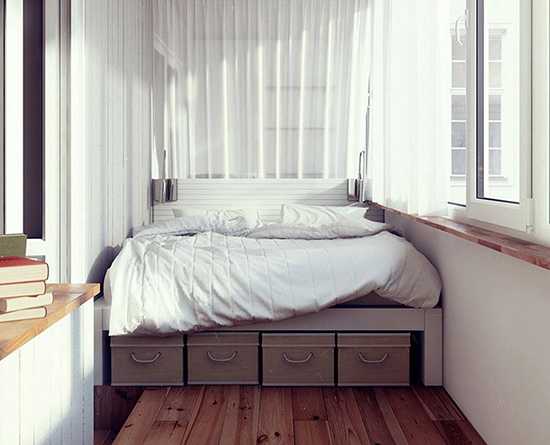 - Маленькое помещение. Не все балконы смогут разместить необходимые предметы, предназначенные для спальни: тумбочки, стол, шкаф, а также кровать. Чувствовать себя комфортно в маленьком пространстве сможет не каждый.