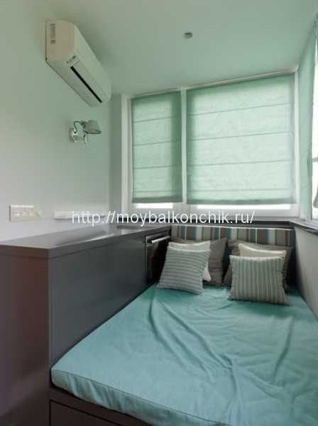 Создавая дизайн лоджии – спальни, для большего уюта на балконные окна можно установить жалюзи или римские шторы. Они, и места занимают мало, и придадут интерьеру завершенность.