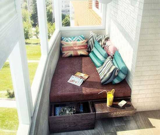 Стандартная кровать часто не влезает, — продолжает Виктория. — Поэтому лучше заказать кровать по размерам балкона или лоджии. Как вариант — матрас-моноблок. Только купите для него красивый чехол, гармонирующий с цветом стен. В некоторых магазинах Москвы представлены кровати, встроенные в балкон. Выйдет дороже, но у них очень удобное изголовье.