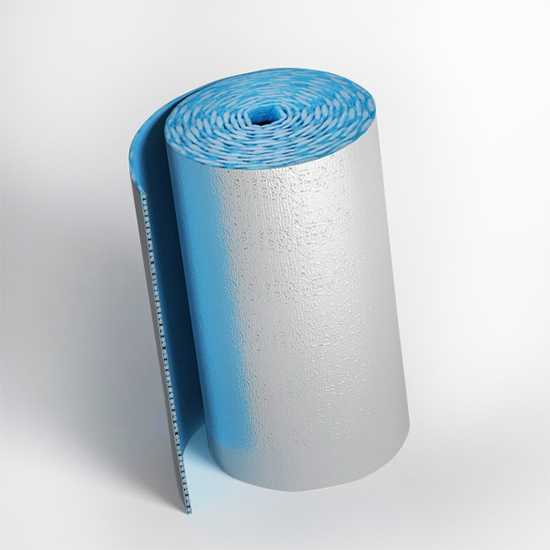 После этого наклеивается слой фольгированного утеплителя – пенофола. Его толщина не играет особой роли. Главное назначение – отражение инфракрасного излучения внутрь помещения. В целях экономии средств и пространства можно использовать самый тонкий – 3 мм. пенофол.