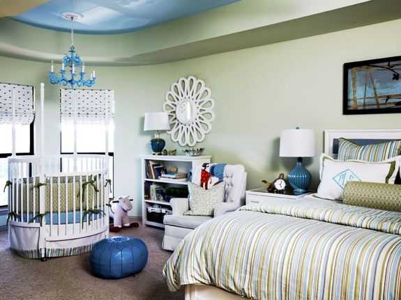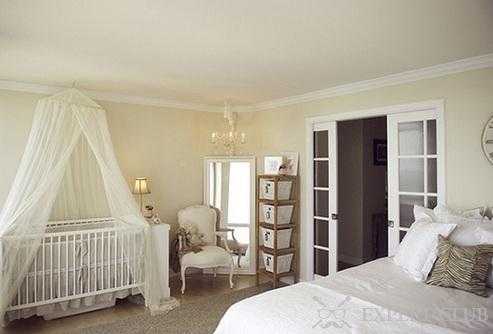 Для счастливых родителей лучшее решение, организовать спальное место новорождённого в своей спальне. Мамочке не захочется, особенно первое время, спать одной. Лучше спальню малыша со взрослой сделать совмещённой. Если места мало, то поставить кроватку у кровати и продумав дизайн, закрыть шторами, балдахином. Если места много, можно отделить часть комнаты гипсокартонными перегородками так, чтобы на кроватку попадало достаточно дневного света и рядом поставить торшер.