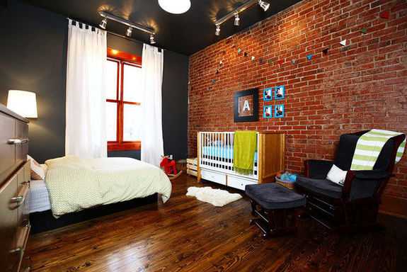 - Детскую и родительскую зоны можно обозначить посредством отделки стен, напольного покрытия и использованием осветительных приборов. Разная фактура и цветовая гамма материалов, неравномерное освещение пространства визуально зонируют комнату, и при этом, не перегораживают ее.