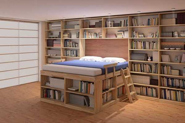 Кровать-подиум с встроенными полками для хранения книг и вещей