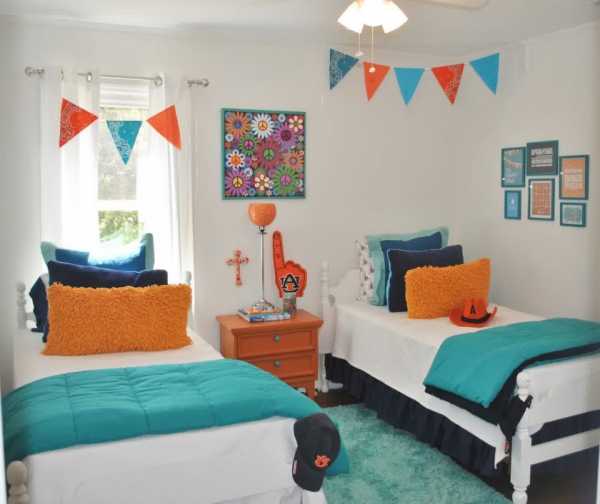 Если стены и вся мебель будут светлых тонов, то ярким оранжевым цветом можно сделать изголовье кровати с голубым узором и такие же подушки.