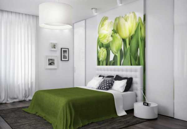 Если стены белые в спальне, то с яркими акцентами больше подойдет покрывало голубого цвета на кровати, зеленые подушки и белое постельное белье.