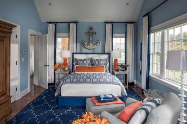 Как правило, в дизайне спальни в ярких тонах главенствует один броский акцент на фоне более спокойных и приглушенных. Например, насыщенный синий и белый; оранжевый и бежевый; яркий голубой и серый.