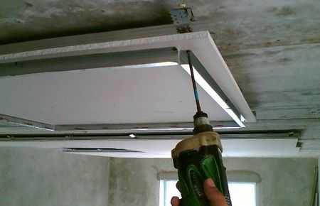 «Настоящие» подвесные потолки собираются из гипсокартона на каркасе из периметрального профиля, несущих U-профилей и связывающих их поперечных C-профилей. Между собой элементы каркаса скрепляются зажимами-«крабиками». К потолку каркас подвешивается специальными регулируемыми подвесами. Такой потолок довольно тяжел, поэтому в потолке заранее сверлятся перфоратором с буром по бетону глухие отверстия под цанги анкерных шпилек 6-10х80-120 мм.