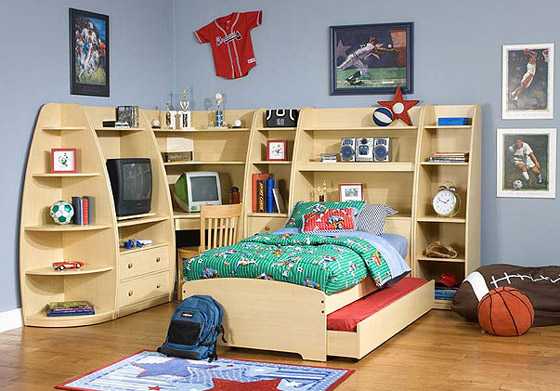 Декоративный ремонт маленькой спальни общего пользования – задача очень сложная. Здесь первый ключевой элемент – уже упомянутая встроенная кровать. Дорогое удовольствие, но сделать такую вполне можно и самостоятельно, выбрав шкаф-купе с большой нишей. Во-вторых, проходной, разумеется, должна быть детская зона.