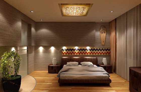 Обычный беленый или крашеный потолок в спальне достаточно хорош, и его можно самостоятельно неплохо задекорировать, см. далее об отделке и дизайне. Но для правильного оформления спальни с точки зрения психофизиологии, см. там же, необходим хотя бы частично выполненный подвесной потолок.
