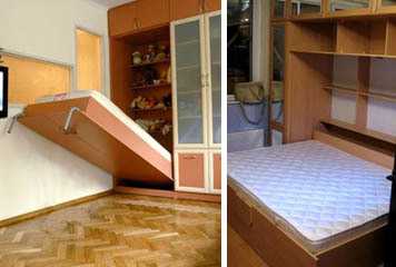 Для «делового» холостяка проблему решает расположение рабочей зоны за кроватью, считая от входа и оформление ее темными тонами (в полумраке теряется). Можно еще физически отделить рабочее пространство, подвесив к потолку японские шторы. За будуарный уголок сойдет небольшой комод с зеркалом над ним. Если же деловые посетители превалируют над романтическими, то необходима и встроенная в шкаф кровать, или кровать-трансформер, см. рис.