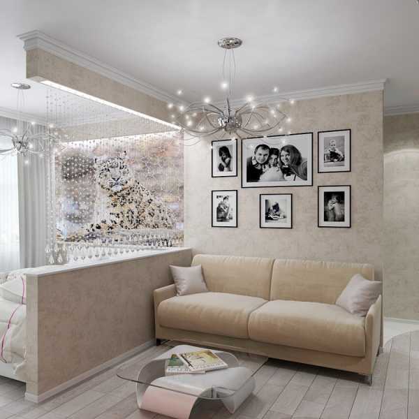 - Для гостиной. При этом световой акцент будет сделан именно в гостиной части комнаты, а спальная и её пространство будет затемнённой. Можно повесить красивую люстру над диваном и креслами зоны отдыха и приёма гостей.