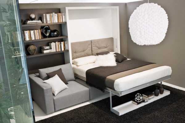 Для многофункциональных комнат раскладная мебель – настоящая находка. В гостиной комфортную кровать можно спрятать в трансформируемый диван, кресло или даже шкаф. А большой обеденный стол для гостей на ночь может превращаться в маленький, туалетный столик. Желательно, чтобы мебель для гостиной-спальни была легкой, подвижной и была оборудована вместительными, выдвижными ящиками для вещей. Для малогабаритных помещений с высокими потолками подойдет встроенная «кровать-невидимка», которая при необходимости скрывается в нишах потолка, пола или стены.