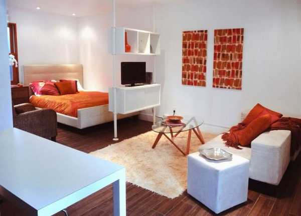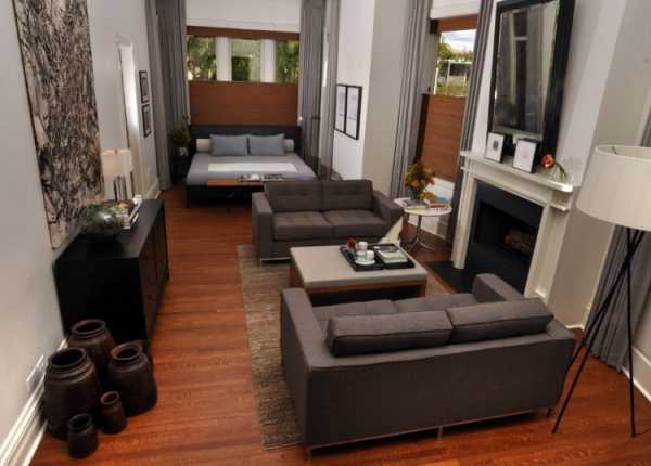 Создание центра гостиной, где будут находиться диванчик, кресла и телевизор. При этом все они будут стоять как можно дальше от основного спального места. Тут важным моментом будет правильное размещение телевизора, чтобы его было комфортно смотреть как с гостиной, так и со спального места. Кстати весьма подходящим выходом из ситуации будет приобретение поворотного кронштейна, который крепится на стенку.
