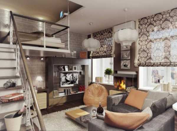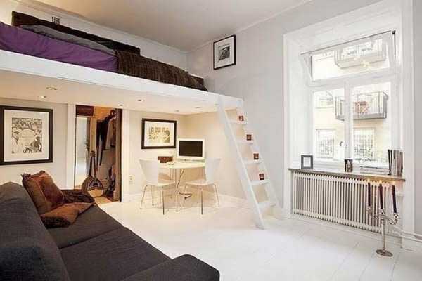 Примерный образ комнаты будет выглядеть так: кровать может находиться под потолком, при этом остальное место внизу занимает гостиная часть.