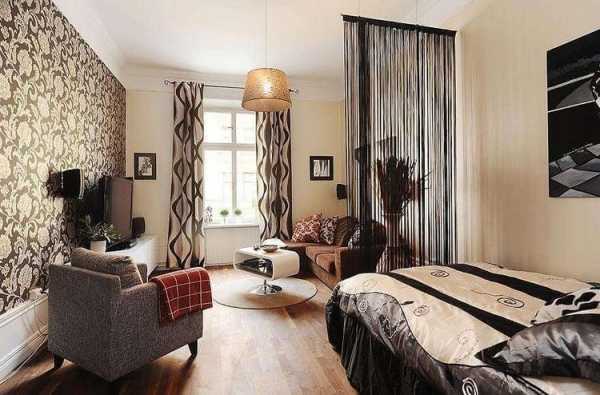 Шторы для спальни-гостиной выбирайте нейтральные, без сложных и пестрых узоров. Всегда уместна классическая контрастная пара – темные, однотонные шторы, которые защищают от солнечного света и жары во время сна, и светлый тюль с жизнерадостным рисунком, наполняющий гостиную позитивным настроением. Загромождать стены картинами не стоит: достаточно повесить динамичное и яркое полотно в зоне гостиной, и более спокойное и нейтральное выбрать для спальни.