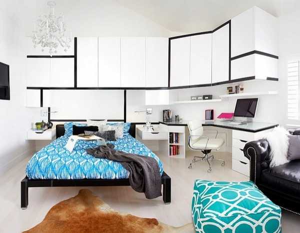 Если вашу комнату будут украшать натяжные или подвесные потолки, предусмотрите несколько точечных светильников над рабочим столом. С возможностью регулировки световых потоков в дополнение вы получите некоторые удобства, как во время работы, так и перед сном.
