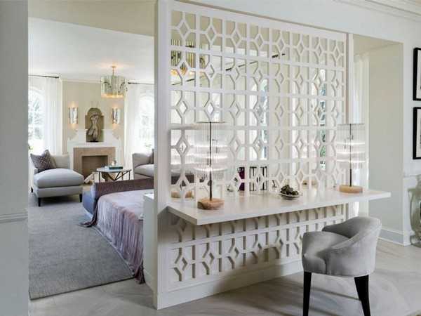 Такая стенка может быть со сквозными полками или встроенным шкафом-купе. При установке глухой перегородки вы получите хорошую звукоизоляцию, но при наличии одного окна, которое будет принадлежать кабинету, зону отдыха будет сложнее проветривать. Можно разграничить пространство декоративной перегородкой, которая будет содержать разнообразные и красивые элементы в соответствии со стилем комнаты, это может быть художественная ковка, резьба по дереву или витражное стекло.