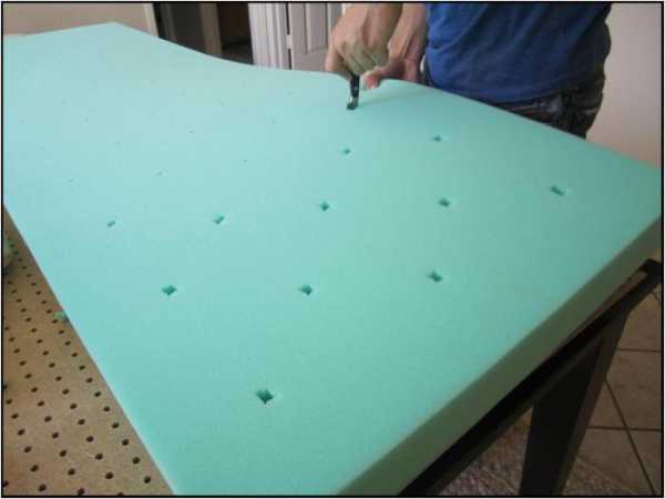 - резка поролона осуществляется на основании габаритов самой фанеры. Вам потребуется осуществить разметку материала, указав область, где будут крепиться пуговицы. Чаще всего пуговицы размещают в шахматном порядке. Используя острый нож, сделайте отверстия для пуговиц в листе поролона;