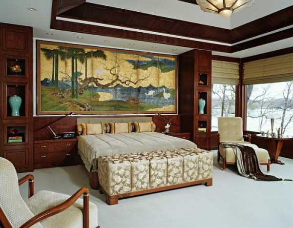 Интерьер будет сочетать в себе ширмы, вееры, а также кровати-подиумы. Допускается небольшое число предметов мебели, изготовленной из натурального сырья темного цвета. Изголовье должно обладать правильной формой. Можно использовать твердый декор или мягкие тканевые накладки с национальными орнаментами.