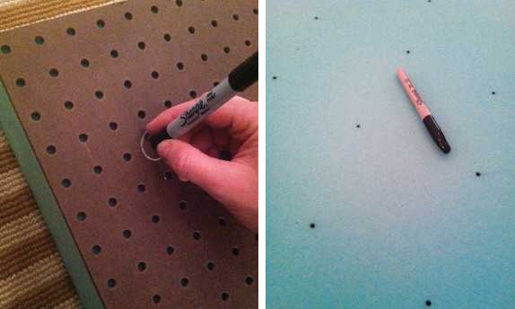 Разметка для “алмазного” изголовьяТретий этап – один из самых ответственных. Зафиксируйте поролон на доске, и отметьте будущие «гнезда» для пуговиц. Проще всего это сделать при помощи маркера. Прорежьте отверстия и совместите поролон с фанерой. Теперь главное ее удержать в этом положении – вот тут-то и понадобятся ватин и клей.