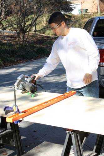 - Разрезаем плиту ОСБ циркуляркой по выбранному размеру (100*110 см). Если циркулярной пилы у вас нет, можно найти фирмы, выполняющие распил по размерам на заказ.