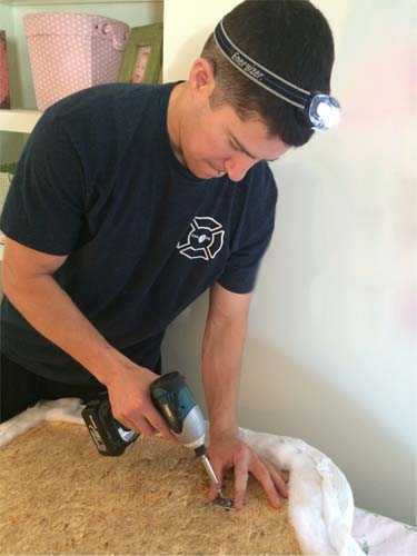 После того как лист фанеры подготовлен, его требуется прикрепить к каркасу. Для этого в каркасе с той стороны, где будет находиться изголовье кровати, высверливаются несколько крепежных отверстий. Обычно деталь крепится к кровати 4-мя шурупами — по 2 с каждой стороны каркаса.