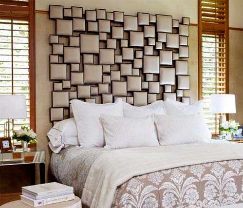 Для сложных дизайнерских решений наряду с капитоне изпользуется комбинирование небольших мягких подушек, выполненных и навешенных по тому же принципу, что и в мастер классе Ирины. Ниже несколько наиболее интересных фото мягких изголовий кровати, выполненных своими руками.