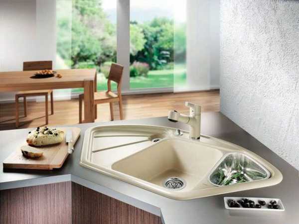 Угловые мойки устанавливают в кухонный гарнитур с угловыми базами, когда необходимо максимально использовать столешницу. В маленьких кухнях важен каждый сантиметр. Угловая мойка обычно имеет две чаши, размер которых позволяет одновременно мыть посуду и подготавливать продукты.