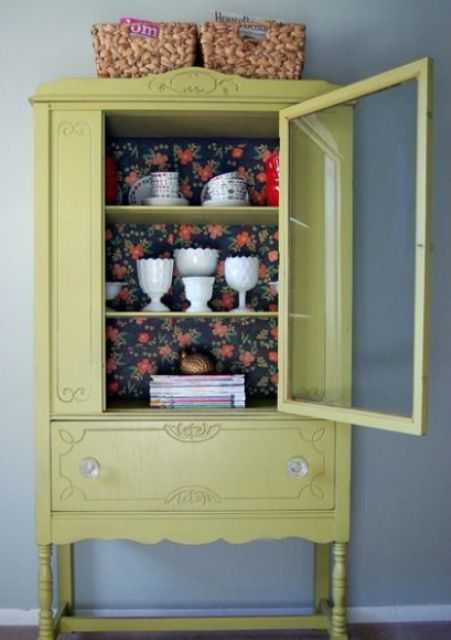 Украсьте свой шкаф тканью с рисунком/принтом или обоями – просто прикрепите или наклейте их внутрь, чтобы сделать ваш шкаф более привлекательным. Рисунок не должен быть слишком маленьким или слишком крупным, он должен быть четким, но не должен отвлекать внимание от посуды и чашек.